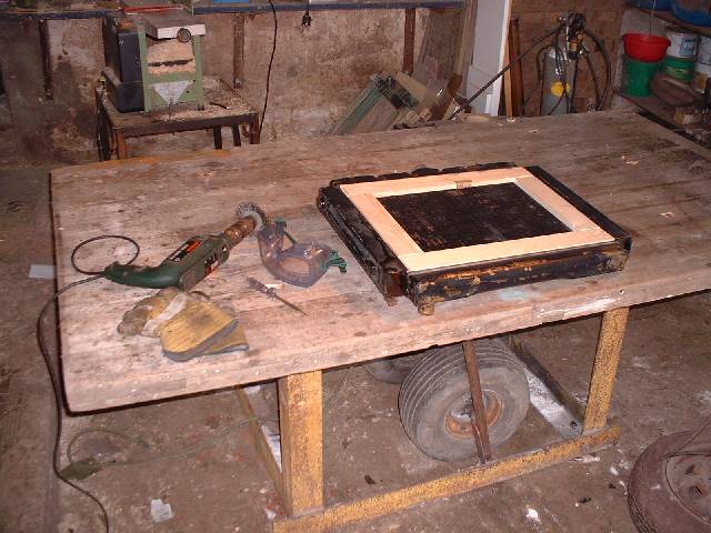 Auch der Kühler mußte sein altes Lackkleid abgeben. Der Holzrahmen schützte die Lamellen vor der Drahtbürste (nachdem ich vorher mehrfach abrutschte ...).